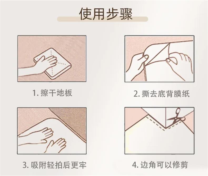 △自粘类条纹地毯,毯面面料为涤纶纤维,毯面为紧密小圈绒,结实耐磨,不惧异物刮蹭,不掉毛,不褪色,绒面加厚,有较高的强度与弹性恢复能力。毯背面为自吸附PVC胶层,撕去保护膜纸极易吸附于光滑的地板面上,粘贴牢固不位移。