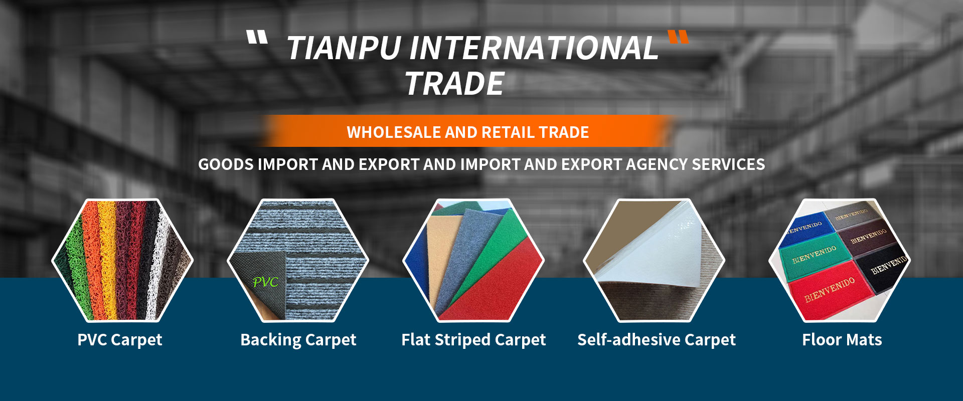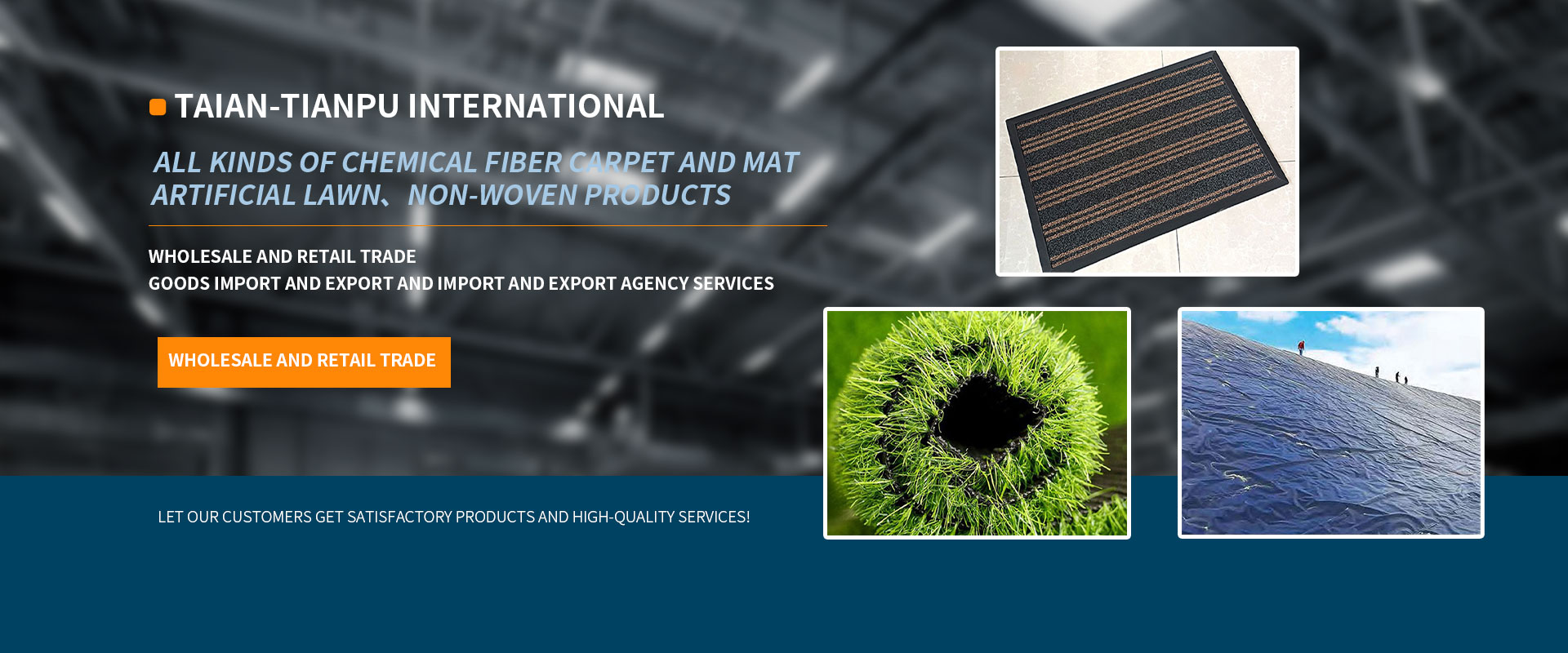 Professional import and export, wholesale: all kinds of chemical fiber carpet and mat, artificial lawn, non-woven products, all kinds of plastic products, plastic machinery manufacturing complete sets of equipment, all kinds of geosynthetic materials, new chemical building materials and manufacturing equipment.